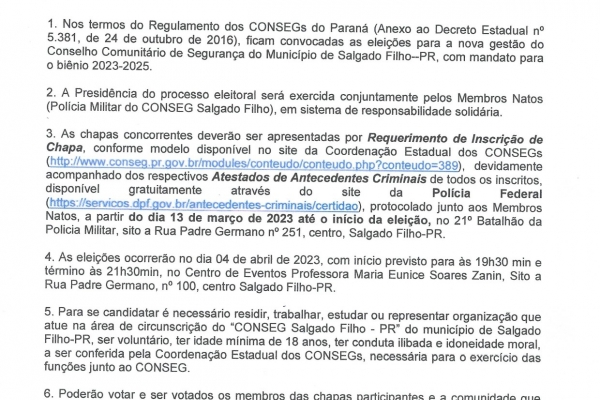 EDITAL DE CONVOCAÇÃO PARA ELEIÇÃO DO CONSEG - CONSELHO DE SEGURANÇA DE SALGADO FILHO.