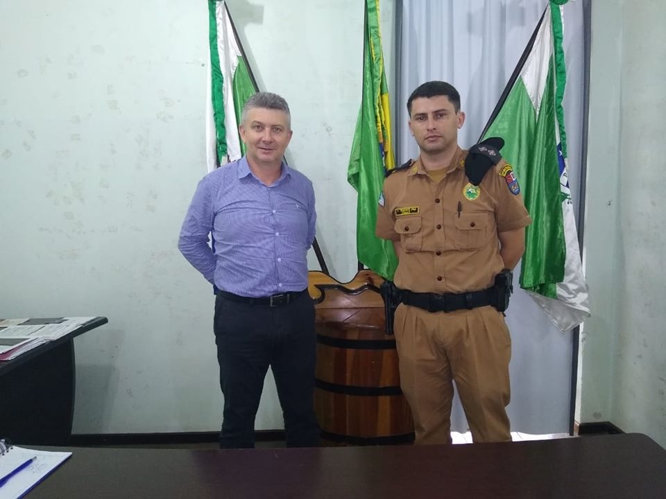 Visita do Tenente Jonas - Comandante do Batalhão de Santo Antônio do Sudoeste ao município de Salgado Filho. O Prefeito Helton recepcionou o Comandante e agradeceu a visita e o serviço que a polícia militar está realizando no município. Foram tratados diversos assuntos administrativos e em especial a concretização do projeto polícia comunitárias comércio seguro.