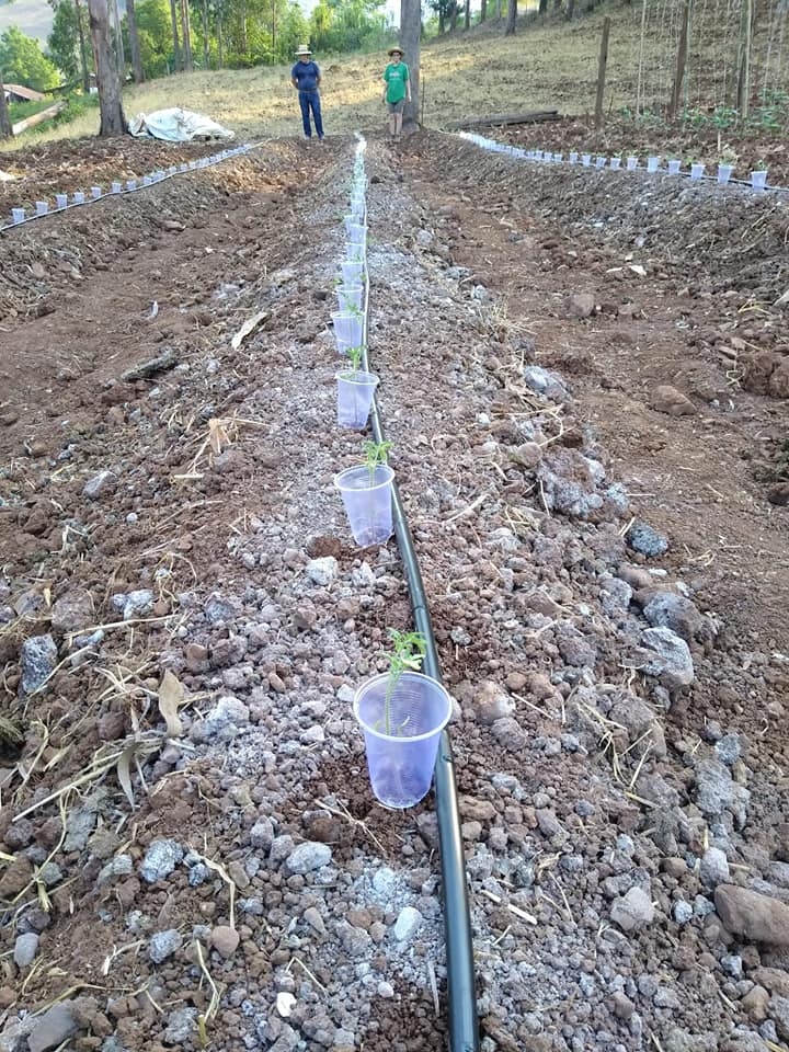 No preparo do solo foi utilizado esterco fresco de bovino e aves, calcário e micronutrientes. Os tratamentos estão sendo feitos com caldas inseticidas (Vinagre de álcool para correção do ph da água, Dipel, Fitoneen e detergente neutro) e caldas fungicida ( cobre, enxofre e leite). A irrigação é por gotejamento. As plantas então sendo conduzidas com duas astes. A projeção de produtividade é de 8 a 10 kg por planta.