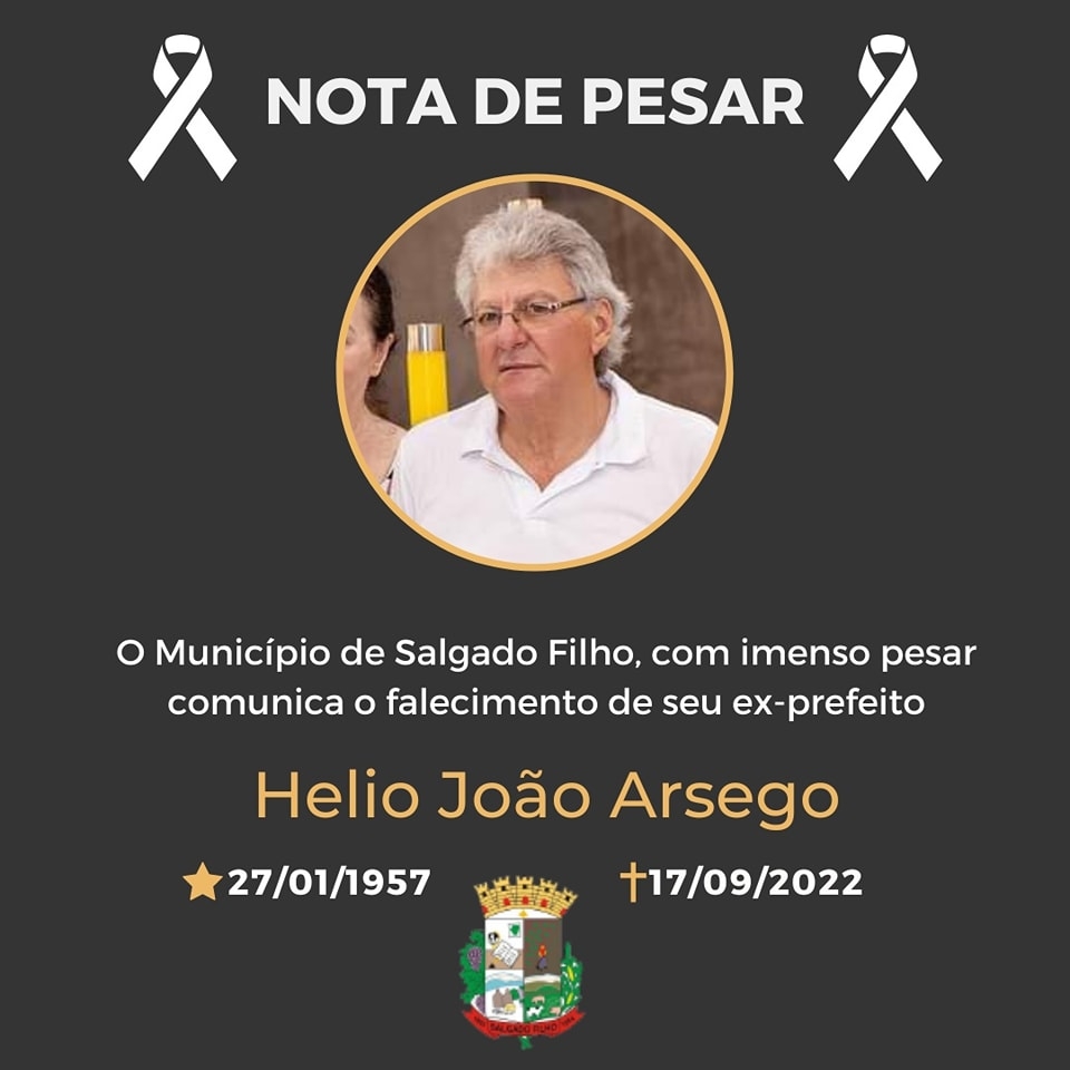 O Município de Salgado Filho, com imenso pesar, comunica o falecimento do senhor Helio João Arsego, ex-prefeito do município de Salgado Filho na gestão 1989 a 1992.