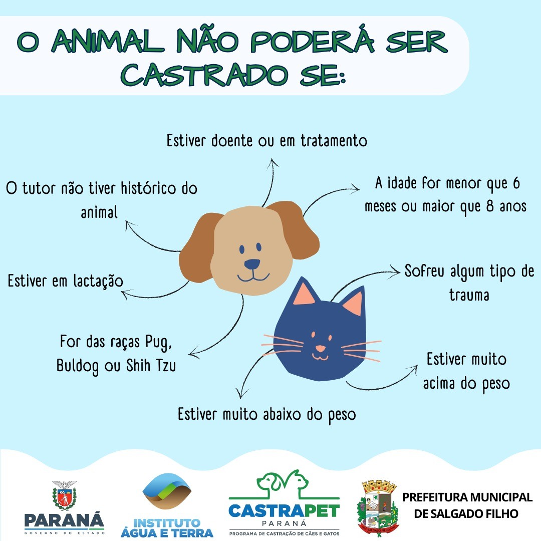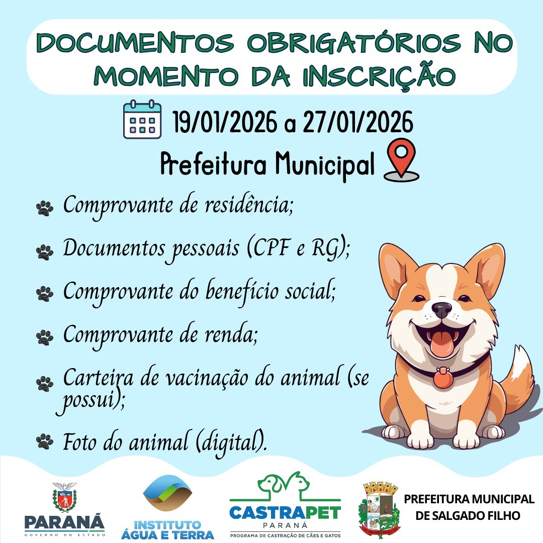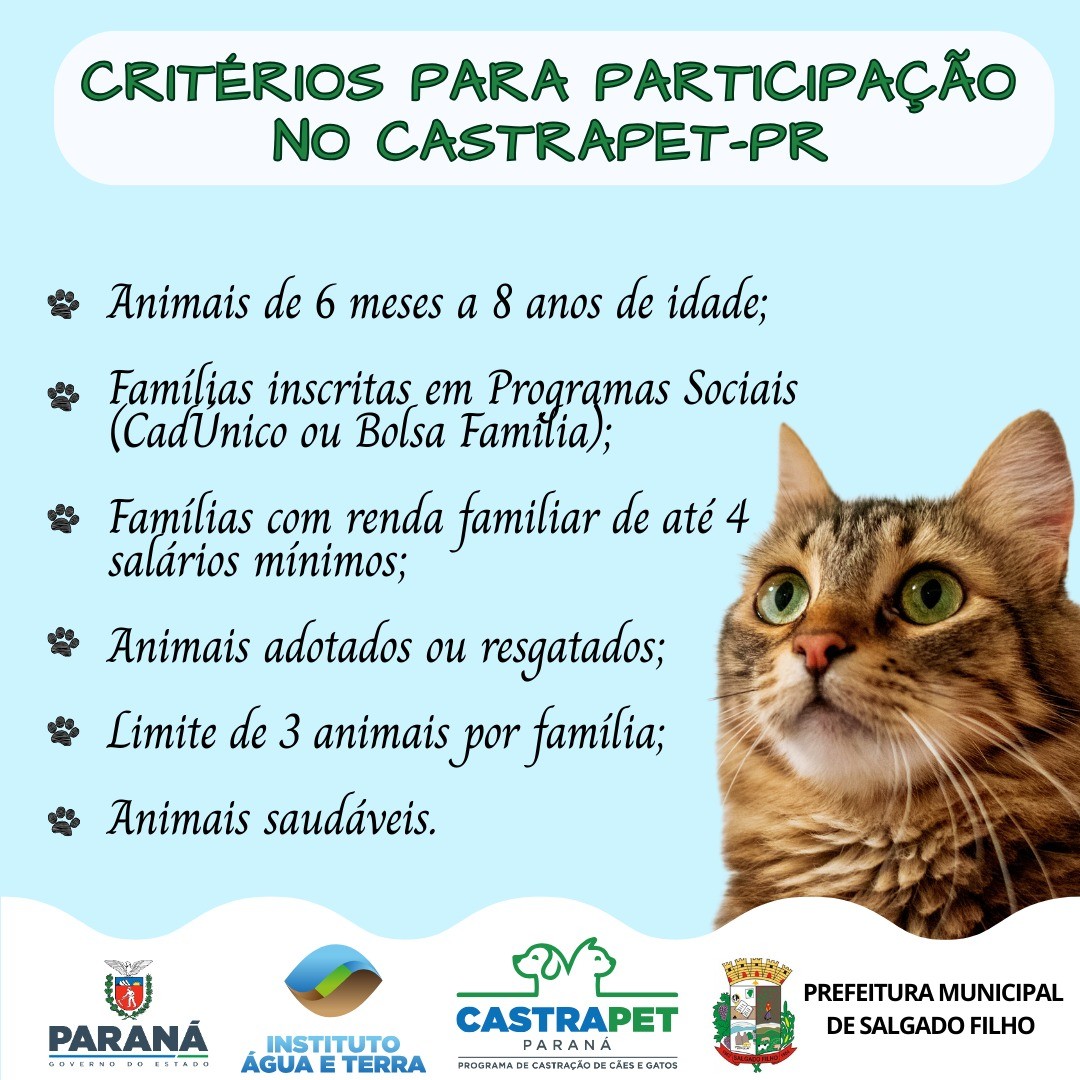 A Prefeitura Municipal de Salgado Filho, por meio da Secretaria de Agricultura e Desenvolvimento Rural, em parceria com o Governo do Estado do Paraná, por intermédio do Instituto Água e Terra – IAT, torna pública a abertura de inscrições para o Programa CastraPet Paraná, destinado à esterilização gratuita de cães e gatos. O objetivo é promover o controle populacional de animais, prevenção de zoonoses e o bem-estar animal no município.