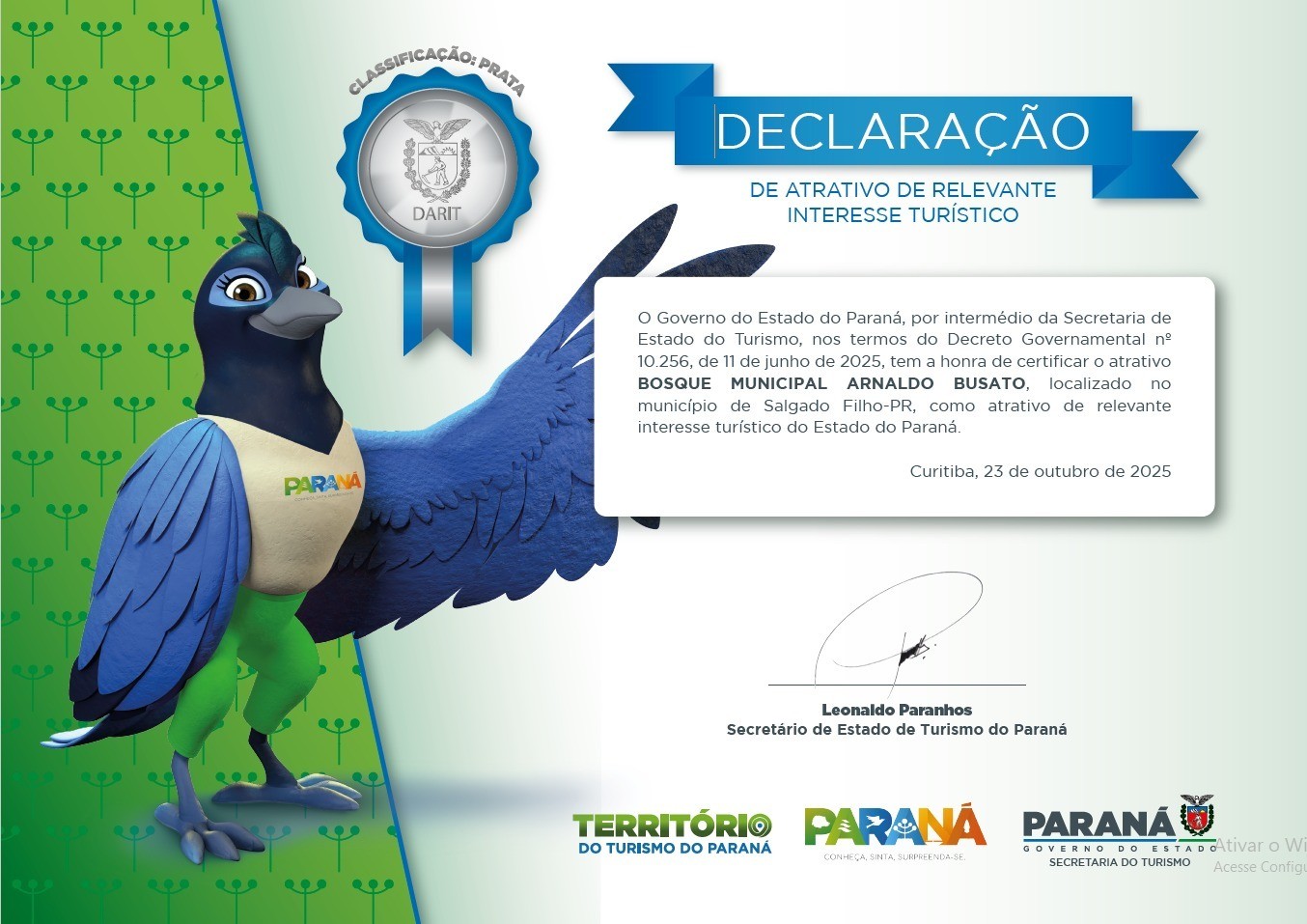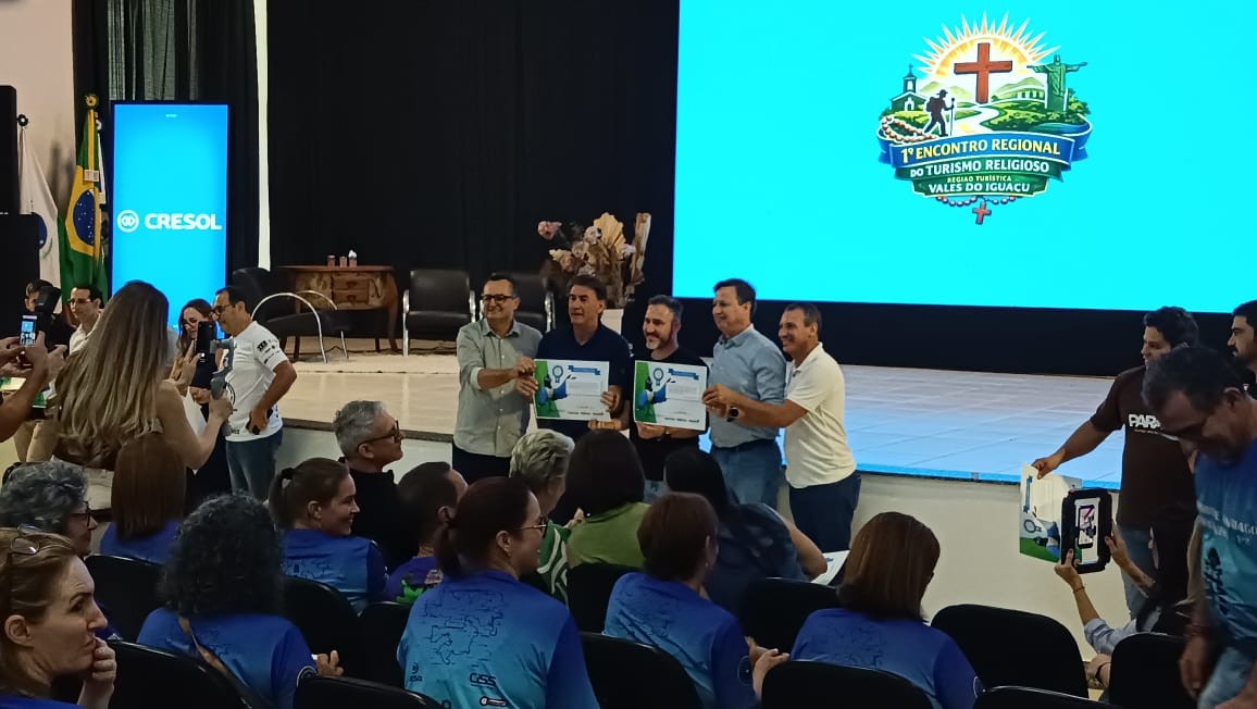 A Administração Municipal através da Secretária Municipal de Indústria, Comércio e Turismo, tem a honra de comunicar que no dia de ontem 26/02/2026 em evento de turismo religioso realizado em Santa Izabel do Oeste, o município de Salgado Filho, recebeu das mãos do Secretário de Estado do Turismo o Senhor Leonardo Paranhos, dois certificados de Relevante Interesse Turístico, sendo um certificado para o atrativo turístico Super Pipa e o outro para o atrativo turístico Bosque Municipal Arnaldo Busato.